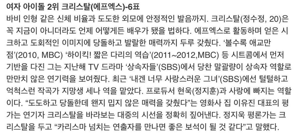 Soojung was chosen as the best idol-actress, she's at #2, got 6 votes from filming industry experts