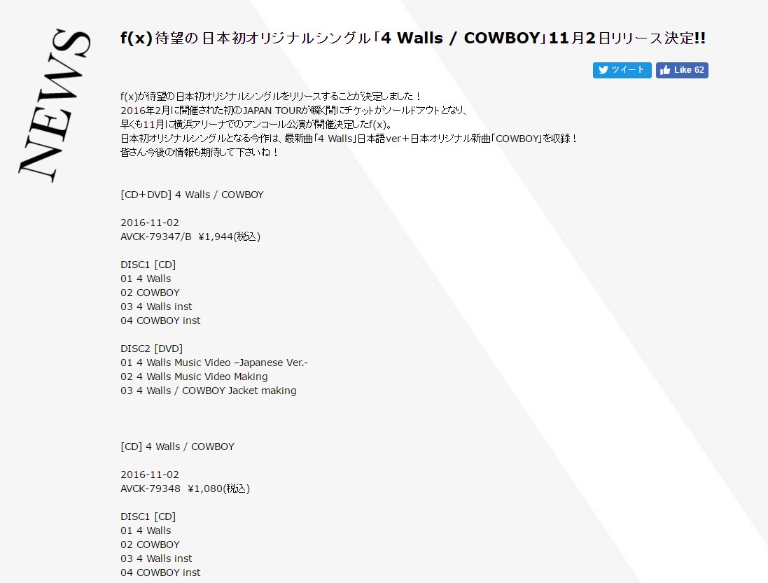f(x) lanzará las canciones 4 Walls y COWBOY en Japón el 2 de Noviembre, 12/09/16.